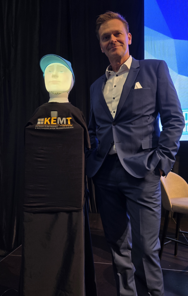 KEMT v stánku FEI, TUKE reprezentovali dvaja naši kolegovia: doc. Ing. Stanislav Ondáš, PhD., ktorý asistoval robotovi FURHAT pri slávnostnom otvorení konferencie v spolupráci s moderátorom Martin Nikodým, a doc. Ing. Matúš Pleva, PhD., ktorý prezentoval biometriu v praxi – technológiu, ktorá čoraz viac formuje budúcnosť identifikácie a bezpečnosti. Hudobným hosťom podujatia bola speváčka Kristína Peláková.