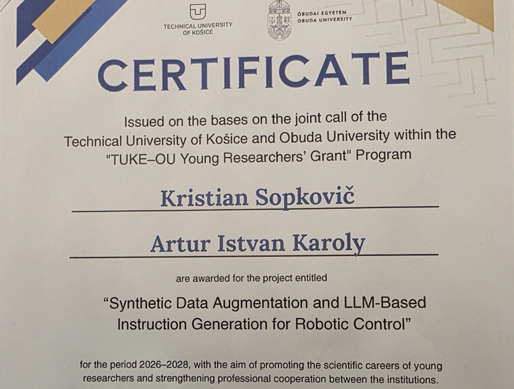 Grant bol udelený na projekt s názvom: „Synthetic Data Augmentation and LLM-Based Instruction Generation for Robotic Control“, zameraný na využitie syntetických dát a veľkých jazykových modelov pri riadení robotických systémov.
