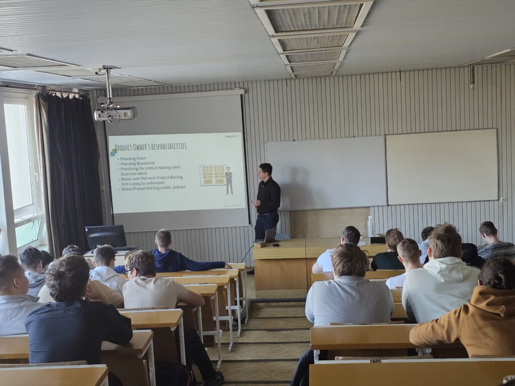 Téma prednášky bola zameraná na kľúčové prvky agilného riadenia projektov, ktoré študentom priblížili praktické aspekty tímovej práce, priorizácie úloh a efektívnej komunikácie pri vývoji produktov.
